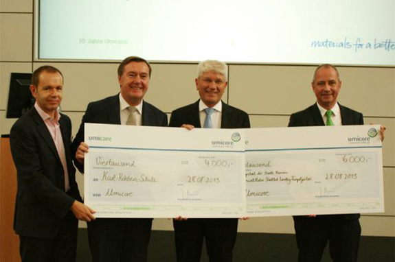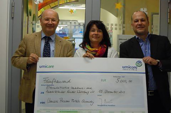 Hanau, 10. Dezember 2013. Umicores Geschäftsbereich Precious Metals Chemistry spendet 5.000 Euro an die Elterninitiative leukämie- und tumorkranker Kinder Würzburg e.V. zur Unterstützung wichtiger Forschungsprojekte im Bereich der Kinderonkologie…