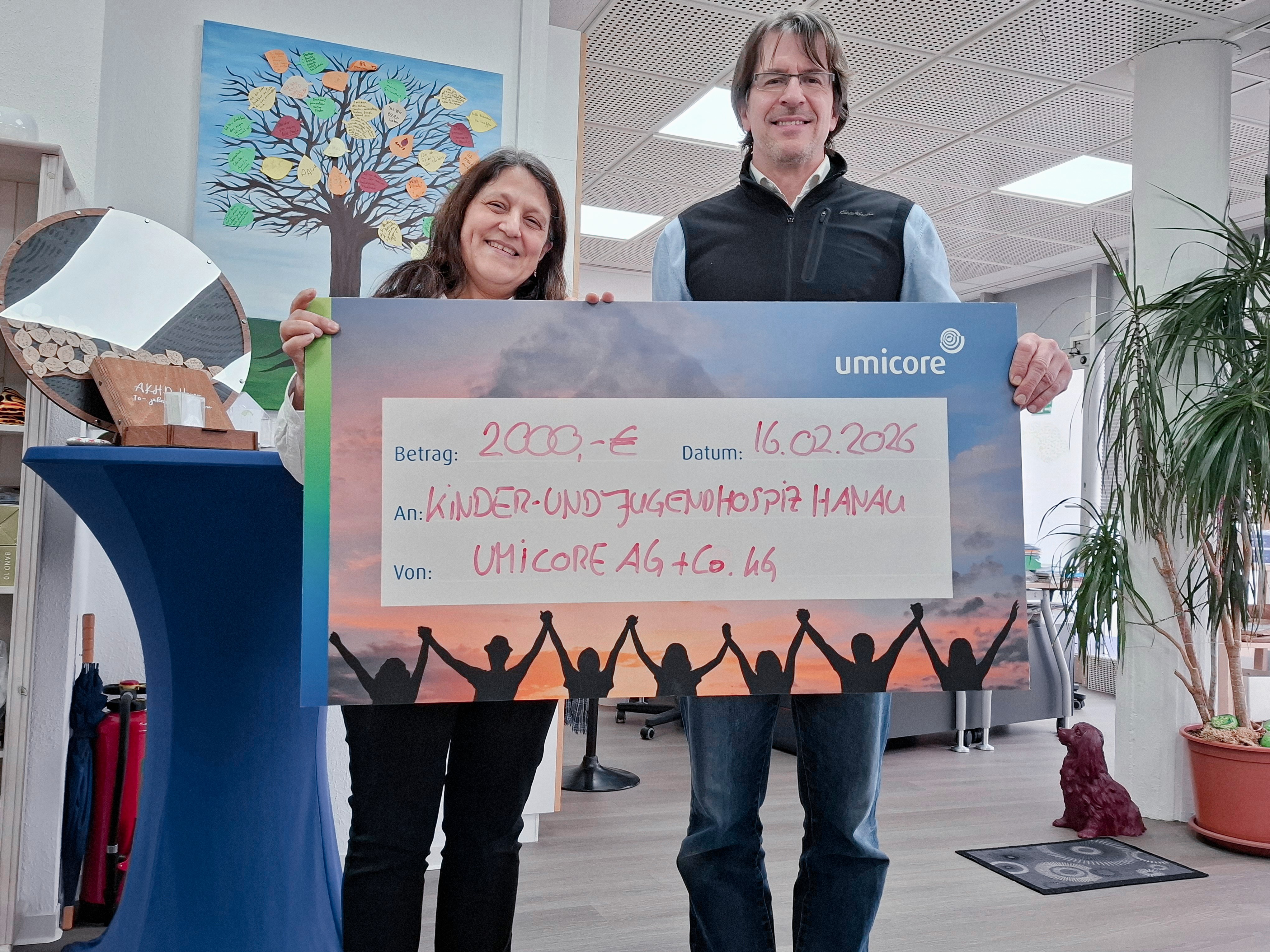 Manchmal sind es kleinste Beträge, die Großes bewegen. Seit über einem Jahrzehnt nehmen sich Umicore-Mitarbeitende am Standort Hanau diesen Satz zu Herzen und spenden monatlich freiwillig die Nachkommabeträge ihrer Gehaltsabrechnung für einen gemeinnützigen Zweck. Traditionell stockt Umicore die über zwölf Monate gesammelten Beiträge auf. Für das Jahr 2025 kamen so insgesamt 2.000 Euro zusammen, die dem Ambulanten Kinder- und Jugendhospizdienst Hanau zugutekommen.