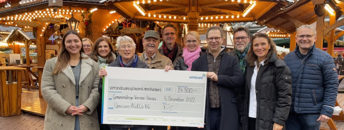 Rund 25.000 Euro spendete der zirkuläre Materialtechnologiekonzern Umicore im Rahmen seiner alljährlichen Weihnachtsspende an das Albert-Schweitzer-Kinderdorf in Hanau, Sterntaler, die Freunde und Förderer Lamboy-Tümpelgarten, den Lions Club Hanau Schloss Philippsruhe und die Karl-Rehbein-Schule Hanau. Überreicht wurde der Spendenscheck durch Dr. Bernhard Fuchs, Vorstand Umicore AG & Co. KG, am vergangenen Montag auf dem Hanauer Weihnachtsmarkt.